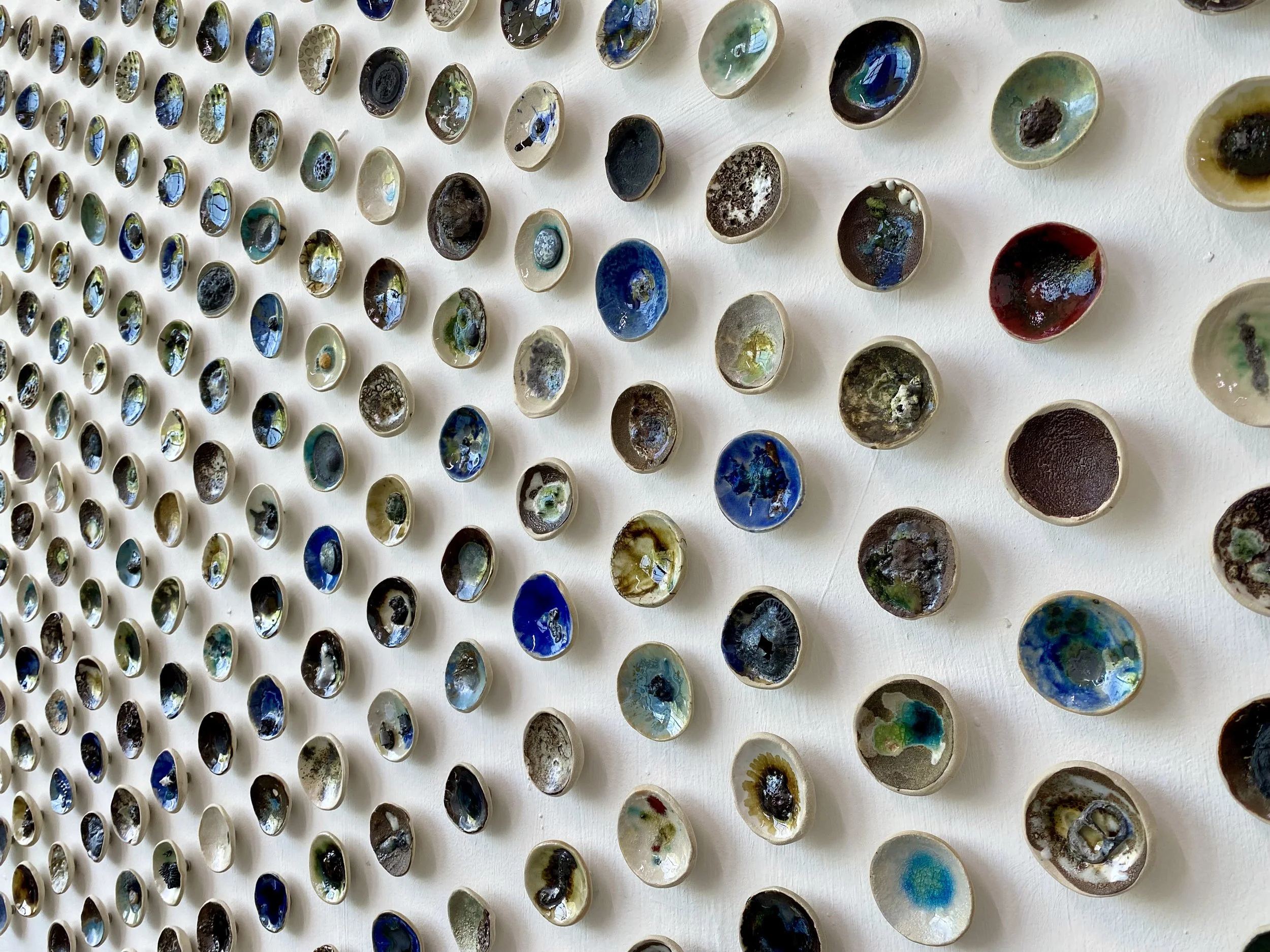 These works were inspired by the concept of technofossils; the geological footprints that humans will leave behind through their material goods. I have been exploring ways of recreating the natural language of the earth through experimental ceramics, making hundreds of small ‘pinch pots’, one of the most fundamental ceramic shapes and an integral part of the ceramicist’s process. Each one of the pots combines waste materials from London, such as dust from the underground and beer bottles found on the street, with different layers of London Geology. I then photograph the hidden universe of the work, invisible to the naked eye, through a magnification lens. In this process, familiar patterns emerge, resembling images from telescopes of nebulas, weather patterns, brain scans, earth's landscape images from satellites. I am fascinated by this iconographic resonance across different areas of life; in cultures, in mathematics and in the natural world, which is repeated within the micro and macro.
